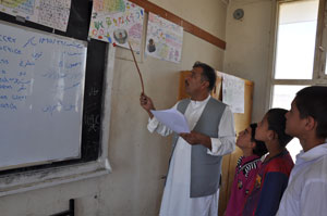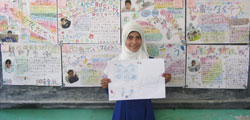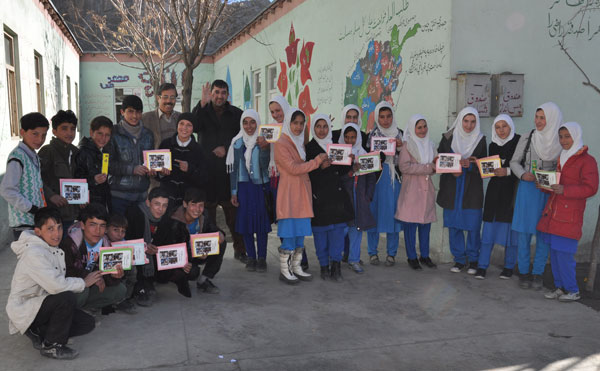 8枚のメッセージはアフガニスタンの首都カブールのAAR事務所に送られ、現地スタッフが5つの学校に持参し、展示・説明を行いました(下左写真)。合わせて17,000人もの生徒が日本からのメッセージを目にしました。極めて不安定な治安情勢が今も続くアフガニスタン。しかし、最近はニュースでアフガニスタンが取り上げられることも少なくなり、人々のあいだには「世界はアフガニスタンのことを忘れてしまったのではないのか」という焦りが広がっています。そんななか、日本の8人の小学生から届いたメッセージは現地の子どもたちの心を強く揺さぶりました。誰に言われるでもなく「お礼を書きたい」という声が上がりはじめ、最終的に50人もの子どもたちが、同じように色とりどりのイラストをあしらったすてきなメッセージを書いてくれたのです。