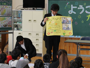 去年11月、AARカブール事務所のスタッフが研修のために来日し、九島小学校への訪問が実現しました。そして、子どもたちにアフガニスタンの様子を伝え、お礼のメッセージを直接手渡しました。