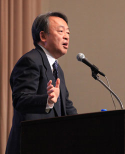 関さんは、企業の立場から社会貢献活動を推進してきました。さまざまな日本企業のCSR(企業の社会的責任)活動の枠組みを紹介したうえで、CSR活動は本業と切り離して『付け足し』で行うものではなく、ビジネスの中に組み込んで行っていくものだとしました。また、日本では、新卒で入社すると一つの企業に一生勤める「エスカレーター型」のため、自分の会社以外の社会のことは何も知らない人間になってしまう場合が多いとして、企業とNGOが人材交流 を広げ、課題解決に向けてともに働くべきだと話しました。