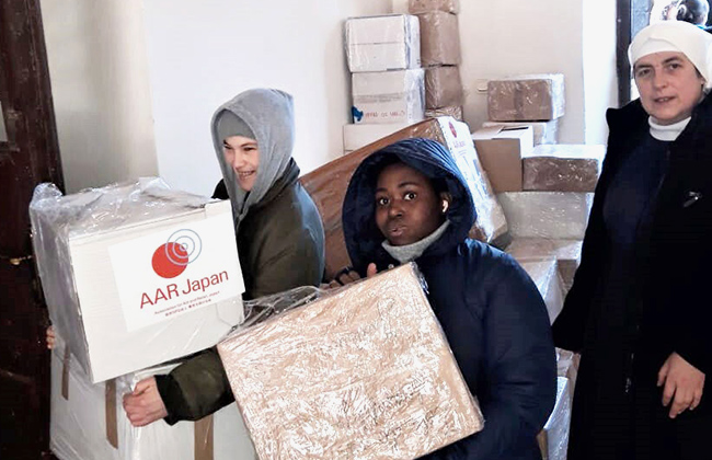 ポーランドの修道会と協働して、食料や医薬品、衛生用品、子ども服などをウクライナに輸送し、修道院や近隣に避難している人々に配付しました。