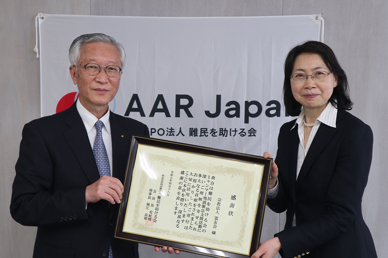 霊友会「ありがとう こだま 基金」は4月18日、AAR Japan[難民を助ける会]のミャンマー地震緊急支援に300万円をご寄付くださいました。同基金の小林勉総務理事は「現地の政情不安によって被災者支援が難しいとされる中、AARは真っ先に現場で物資の配付を始めたと聞いて支援を決めました」と話されました。