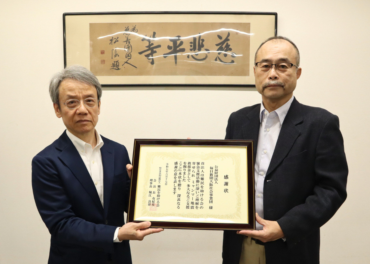 毎日新聞大阪社会事業団(亀井正明理事長)はこのほど、今年3月に発生したミャンマー地震の被災者支援に役立ててほしいと、同事業団に寄せられた救援金の中から100万円をAAR Japan[難民を助ける会]にご寄付くださいました。