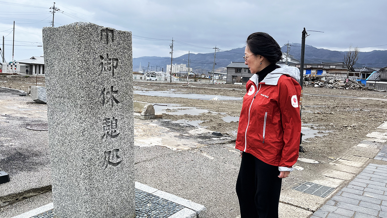 能登半島地震によって大規模火災が発生し、更地となった輪島の朝市跡を視察する水鳥真美理事=石川県輪島市で2025年3月19日