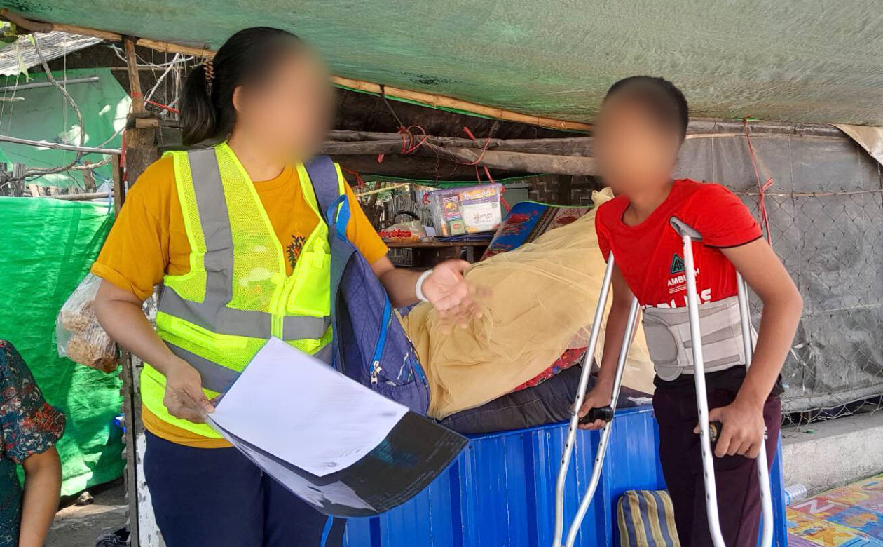 An AAR staff member (left) listens to a survivor who suffered a spinal injury in the earthquake in Sagaing, central Myanmar, April 14, 2025