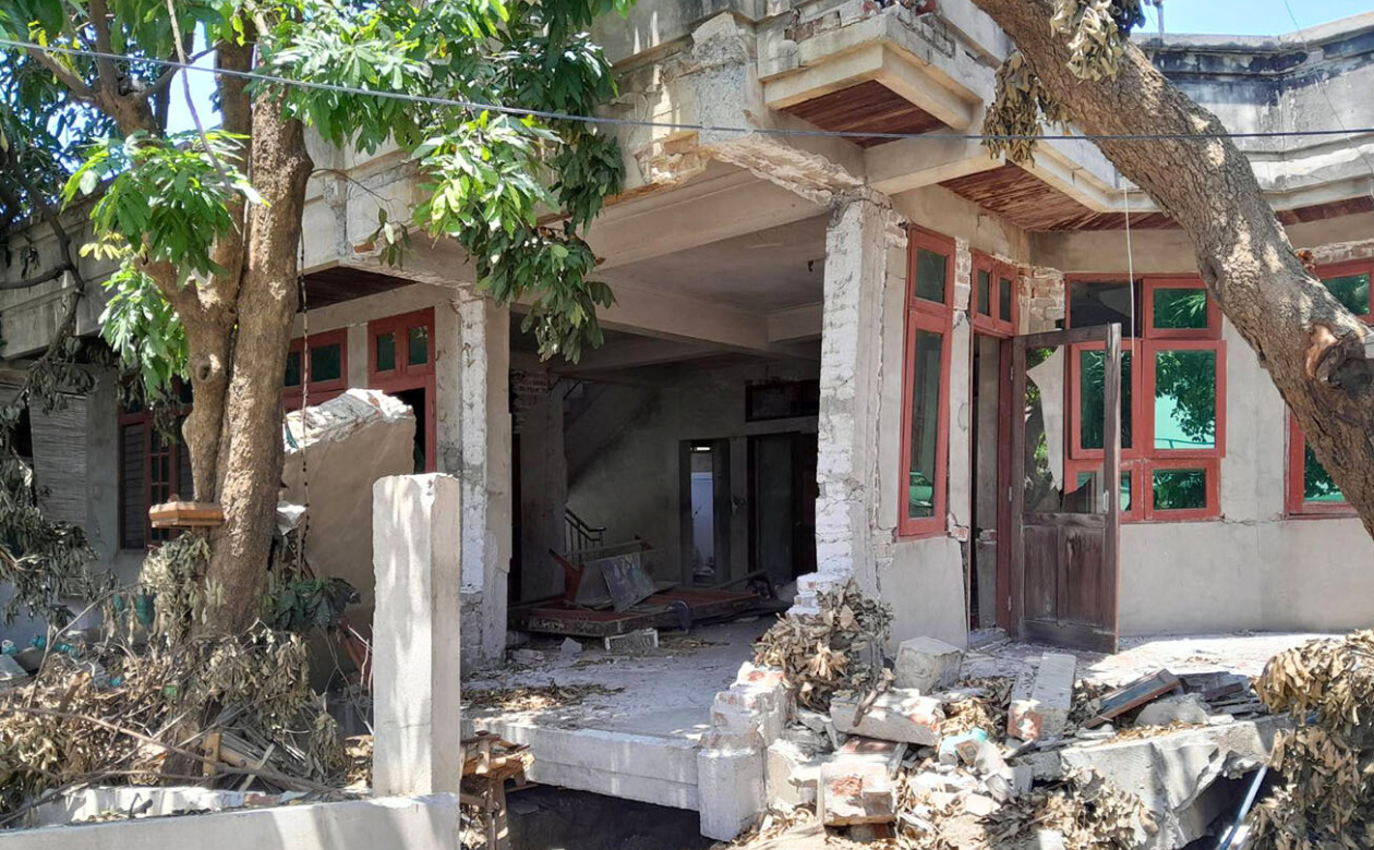 A two-story house whose first floor was crushed by the earthquake (the second floor is shown in the photo). Four family members died in this home in Sagaing, April 14