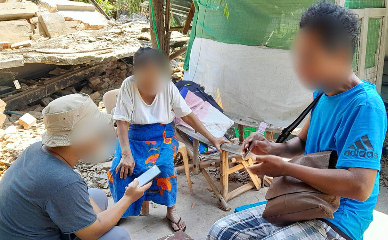 AAR’s local staff member (left) interviews a survivor in front of a collapsed house in Sagaing, April 14