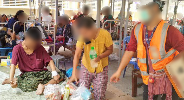 屋外に移動したベッドで治療を受ける被災者に食料を配付する現地協力団体職員=ミャンマー中部ザガイン市のサガイン公立病院で2025年4月5日