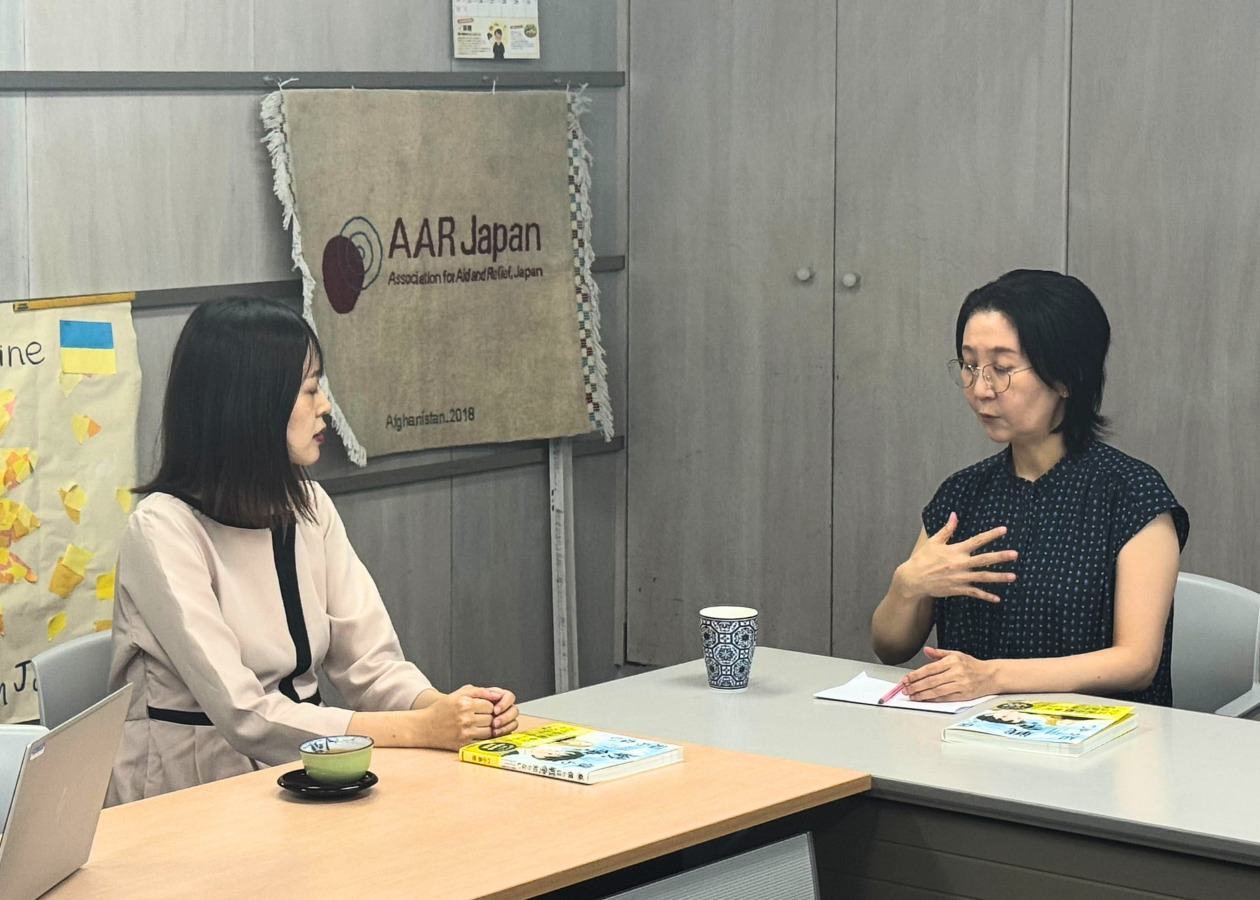 株式会社Gakken『僕らは戦争を知らない』編集担当の澤田未来さん(左)とAARウクライナ事業担当の栁田純子(右)の対談=AAR東京事務所で2025年8月8日