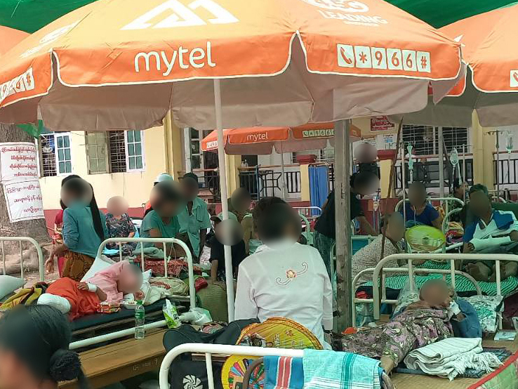 ザガイン市内では多くの建物が倒壊しています。病床数200床のザガイン公立病院も病棟が崩れる恐れがあるため、屋外の敷地にベッドを移動させ、入院患者や負傷した被災者を治療しています。AARと現地協力団体は4日、同病院の患者とその家族に食料を配付しました。