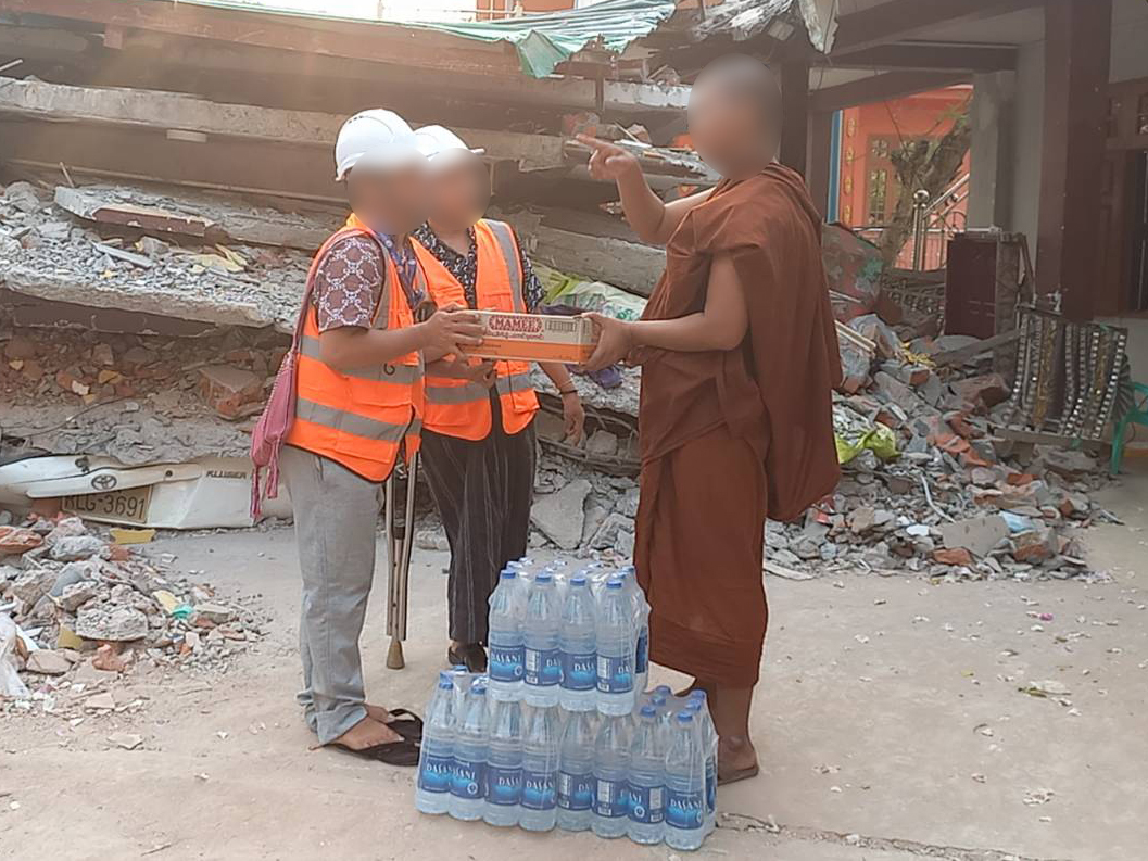 倒壊した僧院の前で食料と水を僧侶に手渡す現地協力団体職員=ミャンマー中部ザガイン市で2025年4月4日