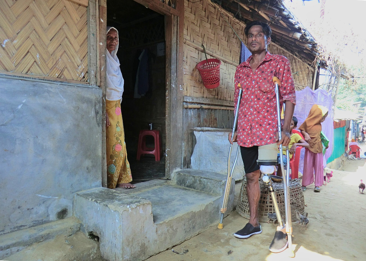 バングラデシュ最南端に位置するコックスバザール県テクナフ郡。粗末な小屋が迷路のように密集するレダ難民キャンプで暮らすシード・ノールさん(34歳)は、2017年の流入時ではなく、それ以前の2008年に迫害から逃れて国境を越えて来ました。シードさんは左脚のひざから下がありません。キャンプ周辺ではしばしば起きることですが、7年前に交通事故に遭ったのです。