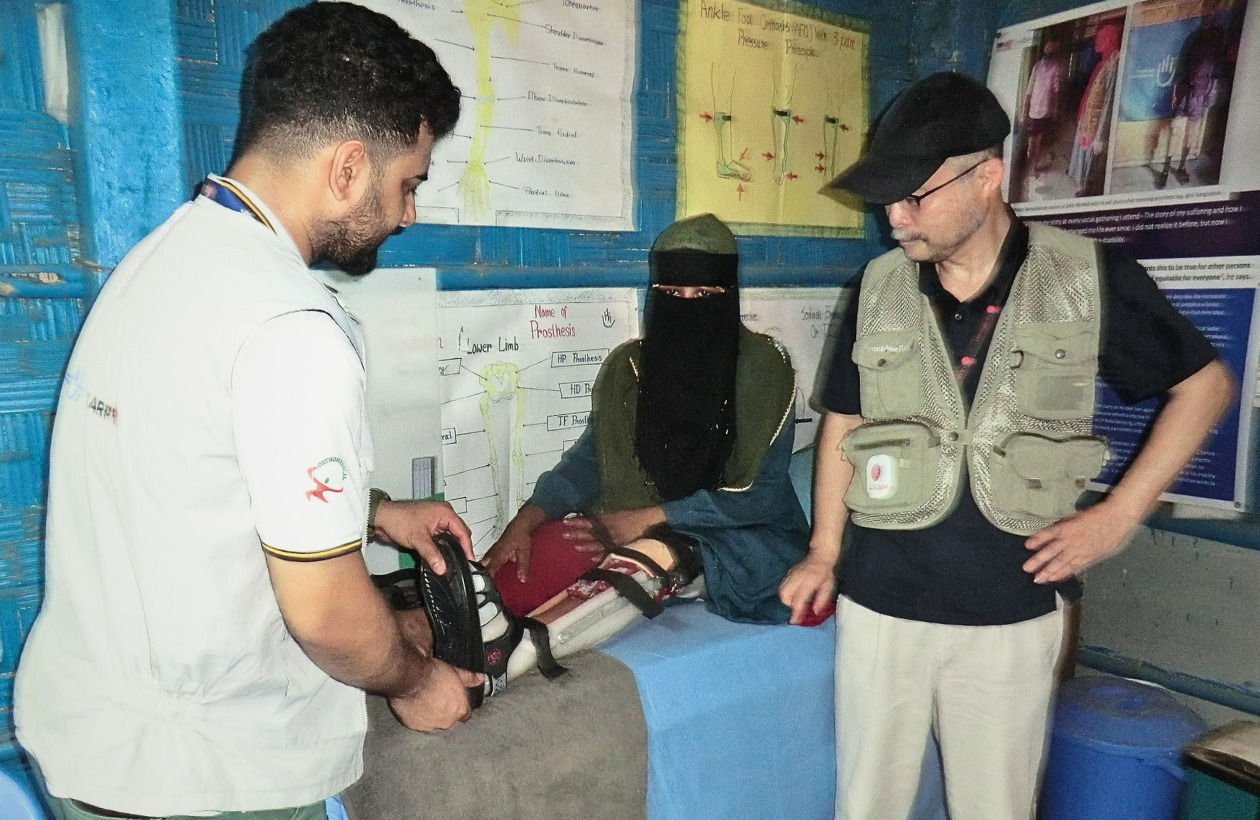 AARが現地協力団体とともに届けた義足を装着するシード・ノールさん=バングラデシュ南東部コックスバザール県のレダ難民キャンプで2025年5月14日