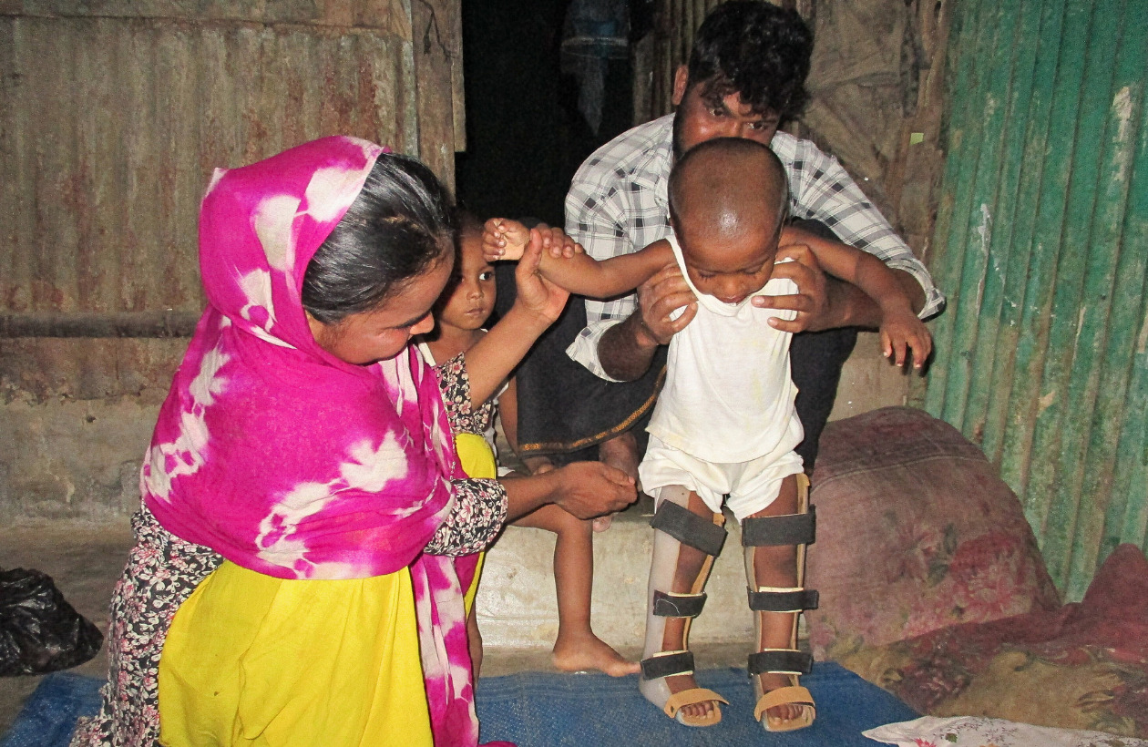 ジサンちゃんの両脚に矯正器具を取り付ける両親=クトゥパロン難民キャンプ