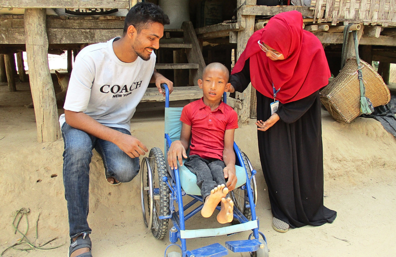 少数民族チャクマのラジャ君(中央)と車いすを提供したSARPVスタッフ=コックスバザール県
