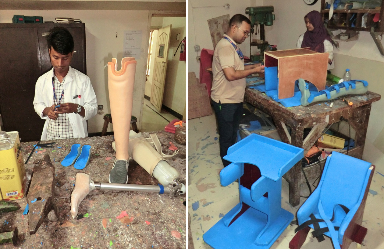 義足や歩行補助具などを製作するSARPVの専門工房=コックスバザール県