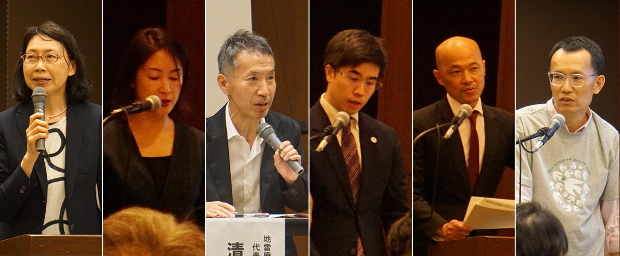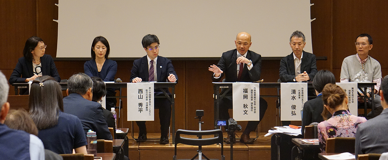 左から、長有紀枝AAR会長、土井香苗HRW日本代表、清水俊弘JCBL代表理事、西山秀平ICRC駐日代表部 法律顧問、福岡秋文外務省軍縮不拡散・科学部通常兵器室課長補佐、紺野誠二AAR地雷対策担当