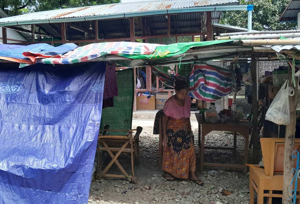 竹材とビニールで作ったテント暮らす被災者=ザカインで6月2日