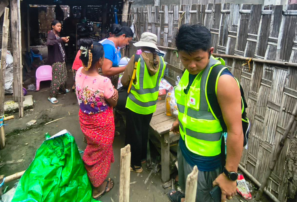 被災世帯を一軒一軒訪問して現金給付と物資配付をするAAR緊急支援チーム=マンダレーで5月25日