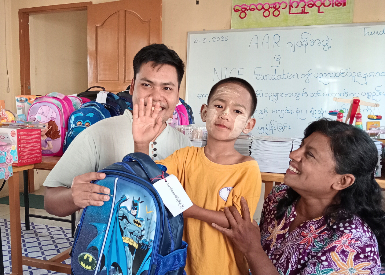 AARの現地スタッフからリュックを受け取り、笑顔を見せる子どもたち=いずれもマンダレー市内で2026年3月