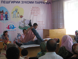 セミナーでは、運動療法の指導と個別相談のほか、障害者リハビリテーション総合病院の医療サービスについての詳しい説明や、タジキスタン国内の障害者団体の活動内容の紹介、またタジキスタンの障害者への公的な社会福祉制度についての説明も行われました。セミナーの参加者たちは、これまで障害者のためのサービスと、どうしたら利用できるかについて知る機会がなかったため、この点でもとても喜ばれました。