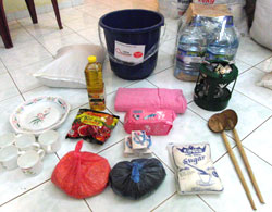 今回支援する物資は1家族分として、米10キロ、豆1キロ、飲料水20L、油1L、紅茶の葉500g、砂糖1キロ、スパイス500g、お皿、コップ、料理用コンロ、料理用お玉、石けん、タオル、女性用生理用品、バケツの15品目になりました。