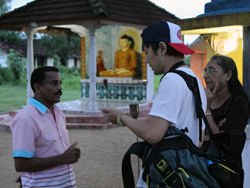 配付地の寺院で現地の村人に被災状況を聞き取り調査する小林通孝(1月31日撮影)