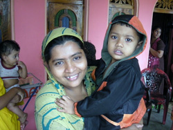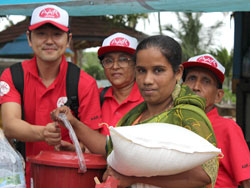 お寺の中には、200世帯分の大量の物資がトラックとともに運び込まれています。雨除けを設置し、現地スタッフと一緒に配付の方法を確認。最後に配付者リストの確認を終え、10時30分から被災者への物資配付を開始しました。最初の配付を受け取った少女は、満面の笑みで自分の体ほどもある支援物資を抱えて帰りました。