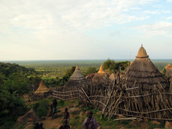 ラフォン郡南東部は中央に大きな山脈が通っています。タレリ村はその山脈と平地の境界部に当たる標高200mほどの山の斜面にあり、テネットという少数民族が暮らす小さな村です。山の東側には広大な平野が広がりますが、平野には家はありません。村人によると、もともとは平地に住んでいたそうですが、スーダンの第一次内戦(1955-1972)の戦禍から逃れるため山の上に避難し、そこに定住するようになったそうです。2度にわたる内戦が終結した現在、政府は地域を発展させるために山から平地へ人々を移住させるよう努力していますが、牛泥棒や強盗などが多いため、村人は引き続き山の上での生活を望み、移住は進んでいません。治安への不安は村人の銃の保有率の高さからも伺え、早朝からカラシニコフ自動小銃を背に畑へと向かう男性の姿が頻繁に見られます。