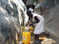 山の上の湧水を汲むタレリ村の女性。平地に井戸ができた今も、足腰の弱い人などには貴重な水源です