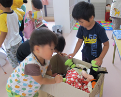 荒浜保育所は、宮城県亘理町の阿武隈川河口近くに位置していました。しかし津波により建物が損壊したため、現在は、被害のなかった亘理保育所の一室と、その隣に設置された仮設の建物を利用して活動しています。本格的に保育を再開できたのはようやく7月11日になってからだったそうです。職員の方は、「震災当日は近くの中学校の3階に避難したものの、押し寄せる津波に死ぬかもしれないとの思いもよぎった」とおっしゃっていました。子どもたち、職員の方々全員が、なんとか無事に避難できたのはなによりでした。7月28日にぬいぐるみとタオルをお届けにあがったところ、子どもたちは箱の中を次々と覗き込み、気に入ったぬいぐるみやタオルをしっかり抱きしめて放しませんでした。