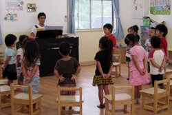 電子ピアノの伴奏で元気に歌う子どもたち。アリス保育園にて(8月30日)