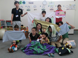 児童デイサービス「めぐみ」にて。タオルを持ってポーズ。後列右端は難民を助ける会の國久容子(6月22日)