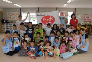 岩手県大船渡市の赤崎保育園で。子どもたちはぬいぐるみに大歓声。「ありがとう」の大合唱でした(7月6日)