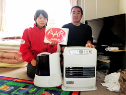 「これで安心して冬を迎えられます」ヒーターと加湿器を受け取る平塚さん(2011年10月5日 宮城県石巻市福貴浦仮設住宅にて 左は難民を助ける会の齋藤えりか)