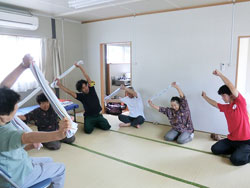 宮城県給分浜仮設集会場で健康体操を行いました。右は難民を助ける会の小菅健太郎(2011年9月17日)