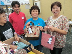 サニーちゃんトートバッグは被災地でとても喜ばれています。中に入った応援メッセージに感激する方々(2011年9月11日 岩手県釜石市の仮設住宅にて)