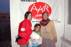 村の親子に支援物資を渡す難民を助ける会の近内みゆき(左)(ディベクデュズ村、2011年11月2日)
