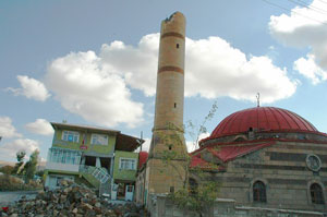 モスクの脇に建つレンガ造りの塔が崩れていました。揺れの強さを物語ります(2011年11月1日)
