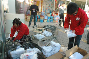 配付用の下着を準備する太田夢香(左)と宮崎淳(右)。子どもの年齢を考慮し、子ども用の下着は3種類のサイズを用意しました(2011年11月2日)
