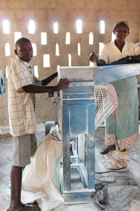 製粉を手伝うダグラスくん(16歳。写真左)製粉の売り上げで新しい教科書を買えました