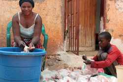 養鶏事業では、生後1~2日のヒナを6週間育て、鶏肉にして販売しています。始めた当初は、ヒナの死亡数の多さが悩みでした。しかし、運営担当者がヒナの管理の質を向上させることで、現在、死亡数やサイズは安定してきています。また重要なのがマーケティングです。昨年は、市場調査をし、宣伝を工夫しました。毎週木曜日や日曜日に開かれる大きな市場で販売をしたり、レストランや会社などで大口顧客の新規獲得を試みています。新しく大口の顧客を見つけることはとても大変で、長期的に粘り強く活動していく必要があります。一方で、個人への販売も地道に行っています。大きなアピールポイントである、無添加で安心であること、味が美味しいこと、そして何よりも就学支援に繋がることを積極的にアピールしています。