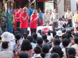 物資配付に先立ち、あいさつをするラオス事務所の岡山典靖(奥左、2011年12月15日、シェムリアップ市チュリュウにて)