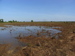 洪水で長期間水没していたために枯れてしまった稲が広がる水田(2011年12月18日、チクラエン郡)