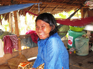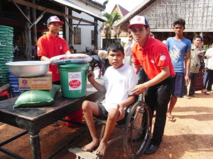 チョエン・ソバルさん(中央、20歳)は車いすを使っています。50cmくらいの深さまで水のある状態が2ヵ月続き、その間車いすでは外に出られなかったそうです(2011年12月15日、シェムリアップ市チュリュウ)