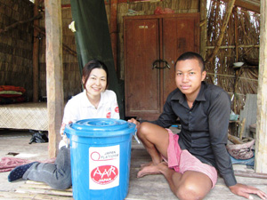 リン・バンさんのお宅を訪ねると、15日に配付した物資のバケツ(右後)がさっそく米びつとして使われていました。(2011年12月20日、シェムリアップ市チュリュウ)