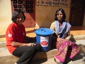 ルウン・ロンさん(右)「野菜を育てて売っていましたが、洪水で収穫できず、飼っていた鶏やアヒルも死んでしまいました。今も借金が残り、生活は苦しいです。いただいたこのバケツは水がめとして使っています。」(2011年12月20日、シェムリアップ市チュリュウ。左は東京事務局の園田知子)
