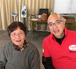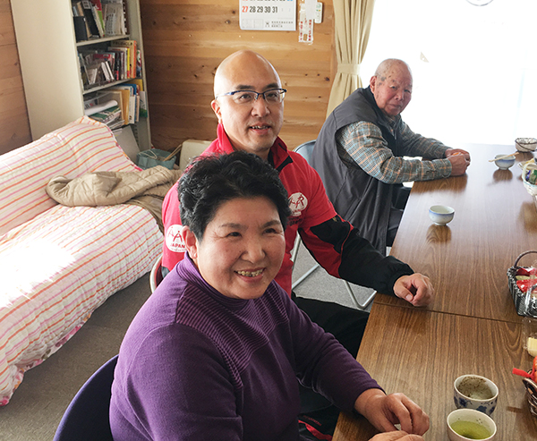 マッサージの順番を待ちながら、お茶を飲んで和気あいあいと話します。中央がAAR東北事務所の大原真一郎(2019年1月13日、南相馬市小池原畑第二仮設)