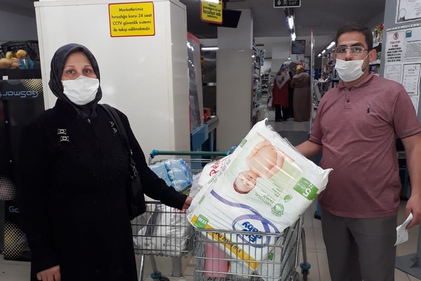 また、AARがこれまで支援をしてきた367の世帯・人々を対象に、650トルコリラ(=約10,000円)分の電子マネーの配付を行いました。この電子マネーは、全国チェーンのスーパーマーケットで利用することができ、カード番号とパスワードをレジで伝えることで、食料品や日用品を購入することができます。