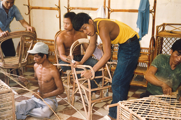 籐細工の職業訓練では、家具やカゴなどを製作(1993年、カンボジア)