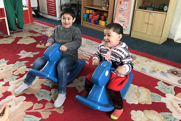 AARが設置した学習支援室で遊ぶ子どもたち。ここでは研修を受けた教員やソーシャルワーカーが、障がい児の学習をサポートしています(2019年、タジキスタン)